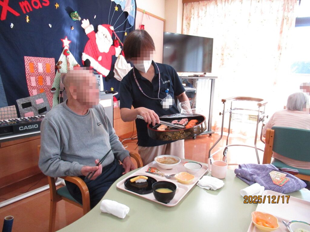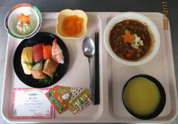クリスマスメニューの主菜はビーフシチューで、握り寿司の提供もありました。