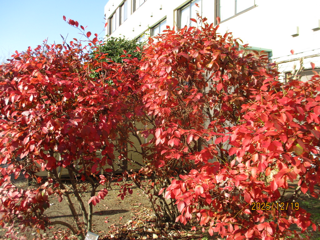遊歩道のブルーベリーが真っ赤に紅葉しています。ブルーベリーは食べても美味しいし紅葉はきれいだしで良い木ですね。