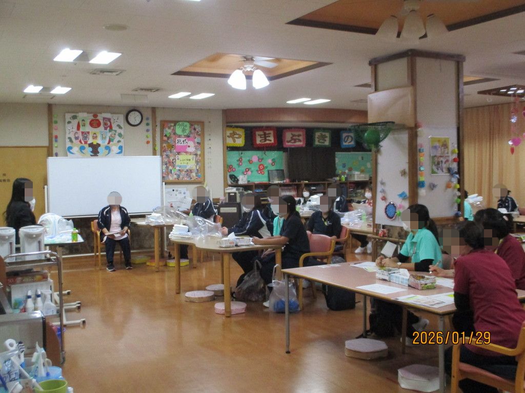 外部講師をお招きし、感染予防に配慮したオムツ交換や嘔吐物処理等の勉強会を行いました。昨年来日した技能実習生も積極的に参加し、充実した勉強会でした。